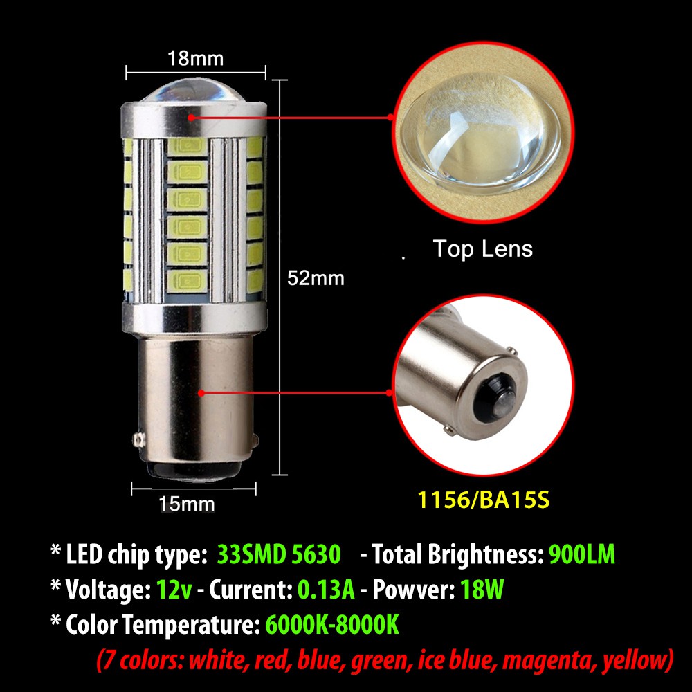 ★ Chuẩn 1156: Cho SH Việt, đèn lùi ô tô, các xe đạp thắng là sáng ★ Chuẩn 1157: Cho winner, dream, wave, SH nhập.. các xe bật đèn tối là sáng, bóp/đạp phanh sáng hơn ★ Bảo hành 01 tháng - Hàng tiêu chuẩn Japan, bao bì + sản phẩm như hình ★ Video tại: https://www.youtube.com/watch?v=mliyOnBB2PQ ★ 01 bóng đèn phanh, stop LED NHẤP NHÁY 18W thấu kính, chuẩn 1156 33SMD 5630 ⚬ Khi phanh, đèn chuyển chế độ NHẤP NHÁY cảnh báo, gây chú ý tới phương tiện phía sau, an toàn hơn trong điều kiện thời tiết, giao thông không thuận lợi. ⚬ Chuẩn chân cắm 1156 - Điện áp hoạt động: 12v - Công suất 18w - Độ sáng: 900LM - Dòng: 0.13A ⚬ Led: 33 chip 5630 + thấu kính phía trước gom tia sáng tụ theo hướng ⚬ Màu: 6000k-8000k (trắng, xanh dương, xanh lá, xanh băng, đỏ, vàng ấm, tím hồng) ⚬ Chân cắm liền bảng mạch chắc chắn, nguyên khối nhôm đúc tản nhiệt cho LED ⚬ Lắp thay bóng đèn phanh, stop của hầu hết các loại xe máy trên thị trường. ⚬ Có thể lắp thay cho đèn hậu, đèn phanh ô tô (chuẩn 1157-12v)