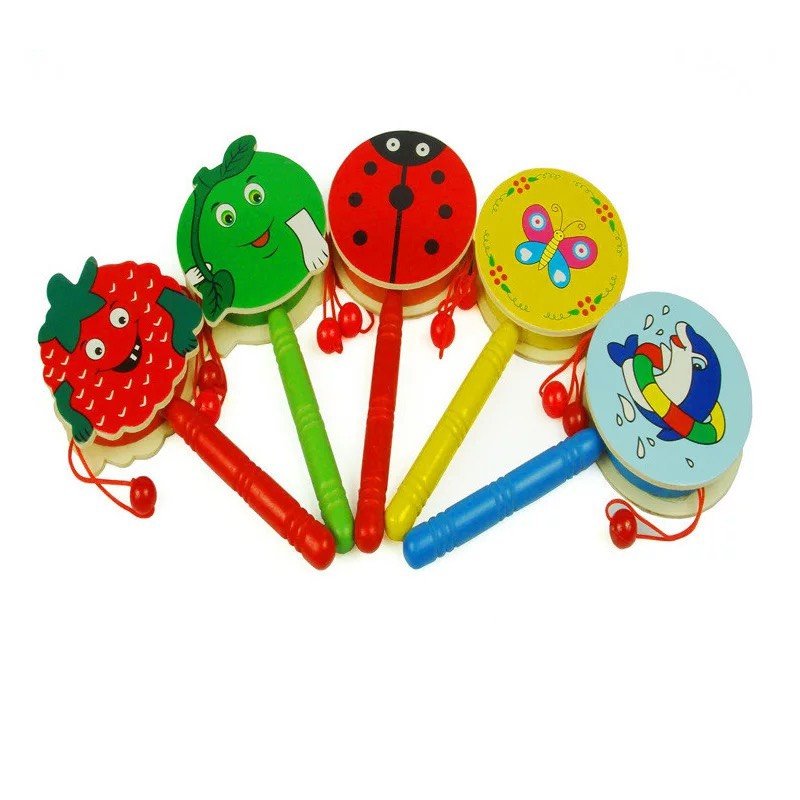 Với các bé từ 3 tháng tuổi trở lên thì các món đồ chơi lục lạc hay xúc xắc là những món đồ chơi rất cần thiết cho các bé tập cầm nắm và cảm thụ âm thanh. Bởi trong giai đoạn này bé bắt đầu tương tác nhiều hơn với các sự vật và sự việc xung quanh, những món đồ chơi nhiều màu sắc và phát ra âm thanh vui tai sẽ rất dễ thu hút bé. Đồ chơi gỗ trống lắc cầm tay là loại đồ chơi mô hình nhạc cụ phát ra âm thanh vui tai khi bé cầm lắc thì 2 hạt tròn có buộc dây đập vào mặt trống tạo ra tiếng kêu với thiết kế mặt trống hình tròn họa tiết dễ thương, màu sắc tươi sáng, chất liệu an toàn được sản xuất tại Việt Nam, chắc chắn đây sẽ là món đồ chơi trống lắc cầm tay cho bé được các mẹ yêu thích.