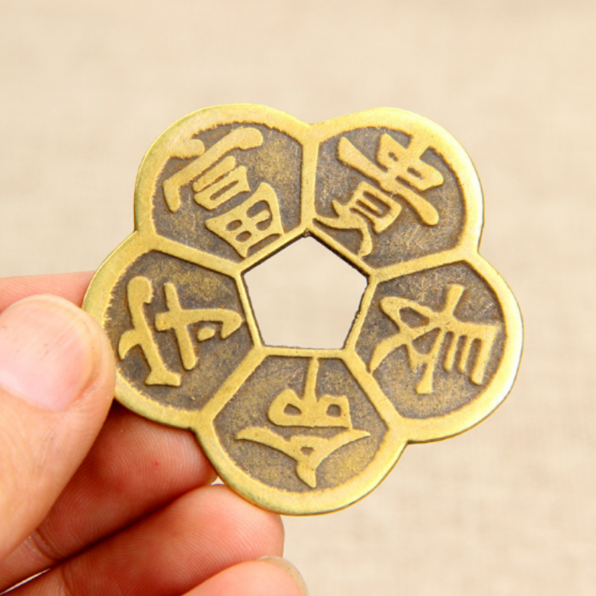 Trong số các loại tiền xu dùng trong phong thủy, tiền Mai Hoa có 5 cánh tượng trưng cho ngũ hành,Tiền mai hoa thường treo thành đôi, 2 bông 10 cánh, tượng trưng cho thập toàn (sự hoàn hảo). Vật khí này được dùng để trấn yểm hung khí, đem lại sự thịnh vượng về tài lộc, kinh doanh. Ngoài ra, nó còn có công dụng rất phổ biến là giải trừ tiểu nhân, tránh thị phi.