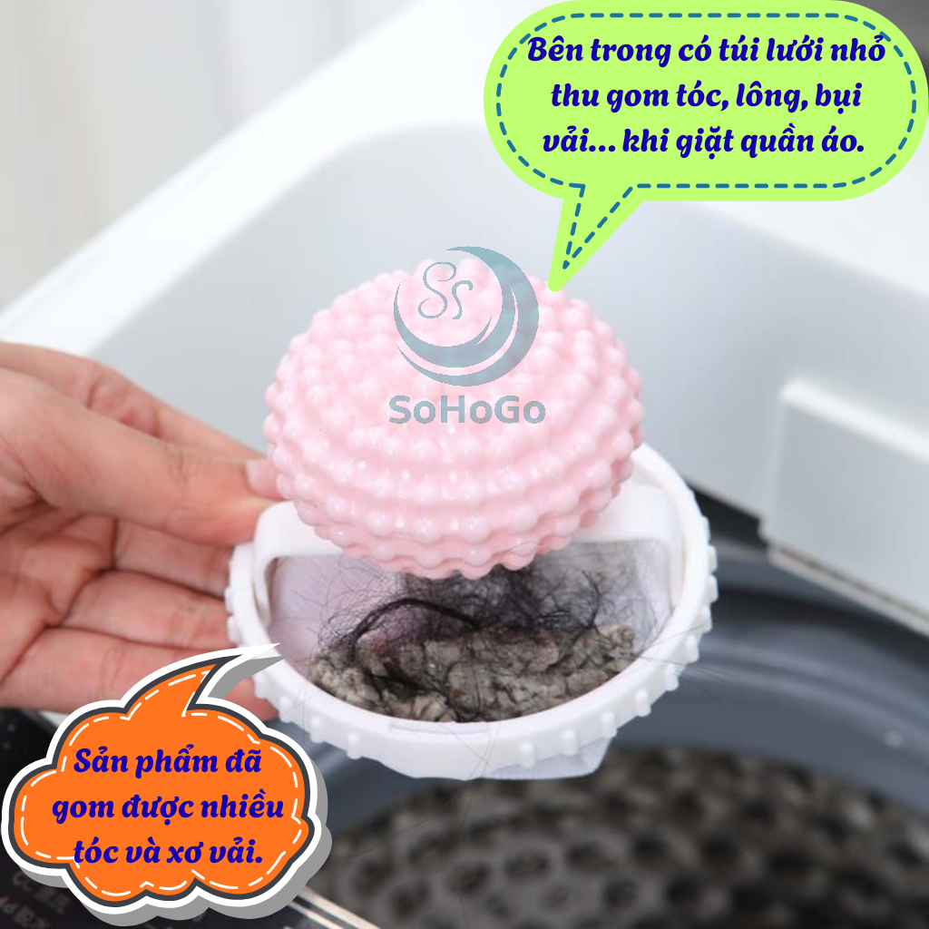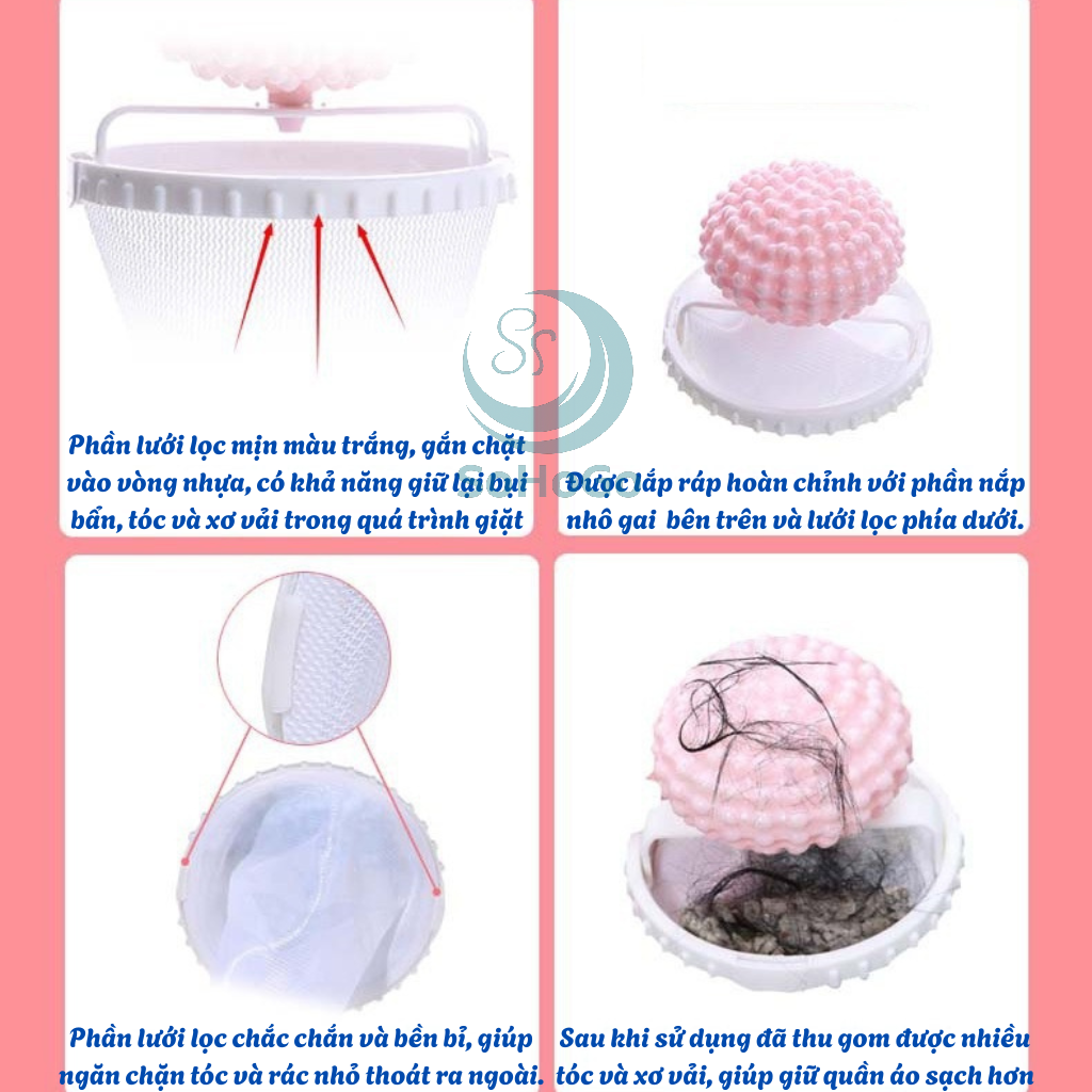 Bên trong có túi lưới nhỏ thu gom tóc, lông, bụi vải… khi giặt quần áo. Ta thấy rõ sản phẩm đã gom được nhiều tóc và xơ vải.