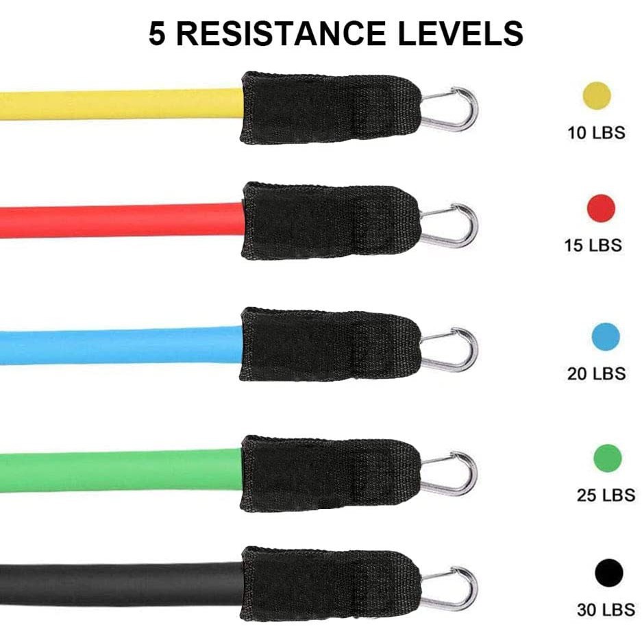 Thông tin sản phẩm: Chất liệu: Cao su Latex siêu bền, kéo giãn thoải mái, không nhanh đứt, giòn dây Năm sản xuất: 2022 Trọng lượng : 150g + 01 tờ giấy hướng dẫn các bài tập + 05 DÂY KHÁNG LỰC cao cấp (Vàng, đỏ, xanh lá, xanh dương và đen) + 02 tay cầm có mút êm ái, có móc sắt nối với dây đàn hồi + 02 đai cổ chân hỗ trợ các bài tập kéo cơ chân, đùi, hông. + 01 neo/chốt vào cửa để cố định dây thực hiện bài tập cơ lưng, ngực... + 01 túi đựng phong cách rất thể thao