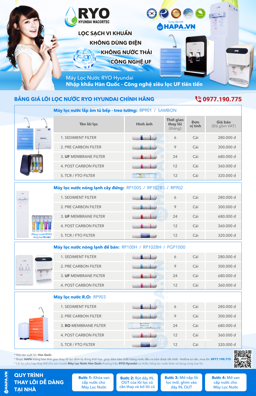 - Lõi dùng thay cho tất cả models Máy Lọc Nước RYO Hyundai: RP901, RP902, RP903, RP100H, RP100S, PGP1000, SAMBON