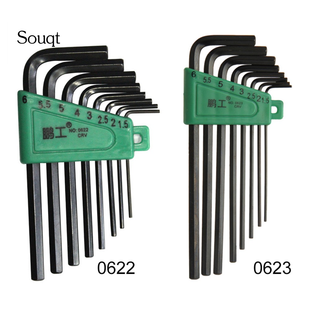 Type: Hexagon Wrench Material: Chromium Vanadium Steel Quantity: 8Pcs Standard System: Metric Hardness: HRC52-54 Features: Durable, Universal, Hexagonal Size Details 0622: 13mm x 82mm x 142mm/0.51" x 3.23" x 5.59" (Approx.) 0623: 13mm x 78mm x 195mm/0.51" x 3.07" x 7.68" (Approx.)