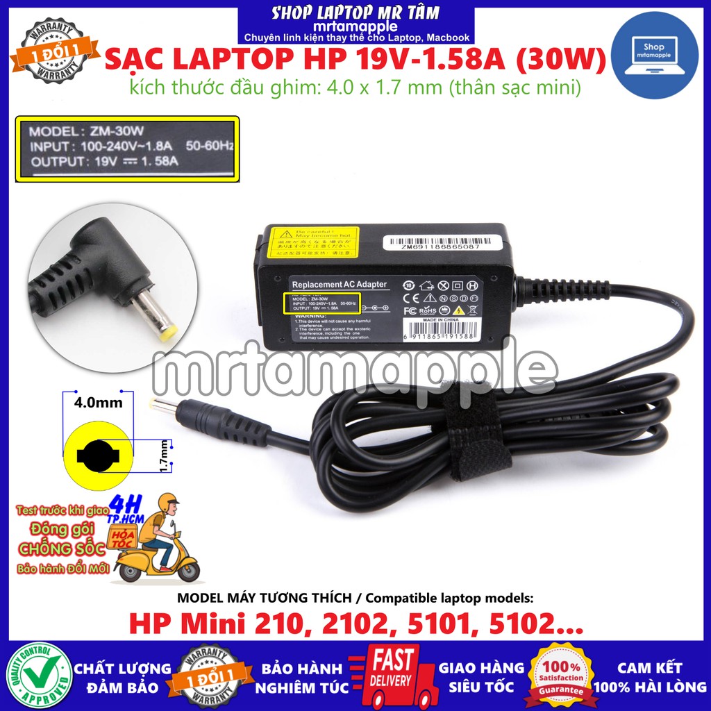 DANH SÁCH MODEL LAPTOP DÙNG LOẠI SẠC NÀY (danh sách có thể không đầy đủ): HP Mini 210, 2102, 5101, 5102 ========= THÔNG TIN SẢN PHẨM: ✔️Loại Sạc: SẠC LINH KIỆN THAY THẾ. ✔️Hình thức: SẠC MỚI (chưa qua sử dụng). ✔️Bộ sản phẩm bao gồm: Thân sạc, cáp nguồn sạc, Hộp đựng. ✔️Thông số sạc: ➕Công suất đầu ra (Out-put): 19V-1.58A (30W) ➕Loại đầu ghim: mini ➕Kích thước đầu ghim: 4.0 x 1.7 mm Lưu ý để mua đúng loại sạc: (XEM VÀ SO SÁNH VỚI SẠC GỐC ĐANG DÙNG) ✔️BẮT BUỘC mua đúng loại đầu ghim và kích thước đầu ghim sạc. ✔️BẮT BUỘC mua đúng số Vol với cục sạc gốc/ máy laptop. ✔️CÓ THỂ chọn mua sạc có thông số Ampe cao hơn so với cục sạc gốc. ========= Cảm ơn và Chào mừng Quý Khách đã ghé thăm gian hàng của ✔️Shop Laptop Mr Tâm✔️ (English language customers are fully supported) Shop chuyên kinh doanh linh kiện thay thế cho LAPTOP và MACBOOK. Chúc bạn tham quan và order vui vẻ. Shop Laptop Mr Tâm (mrtamapple) CAM KẾT: ✔️Bán sản phẩm đúng mô tả chất lượng. ✔️Luôn TEST SẢN PHẨM hoạt động tốt bằng board test chuyên dụng trước khi đóng gói. ✔️Đóng gói sản phẩm bằng hộp giấy carton cứng CHUẨN CHỐNG SỐC, CHỐNG NƯỚC có TEM SEAL NIÊM PHONG bên ngoài hộp để đảm bảo đúng và đủ hàng không bể vỡ. ✔️Hỗ trợ giao hàng HỎA TỐC 4H (TP.HCM). ✔️Bảo hành sản phẩm (1 đổi mới 1) nghiêm túc, đổi trả nhanh gọn hậu bán hàng. KHUYẾN KHÍCH: ✔️Khách hàng QUAY LẠI VIDEO MỞ HỘP SẢN PHẨM để khiếu nại nếu có sự cố sản phẩm do quá trình vận chuyển. ✔️Giữ lại hộp đựng sản phẩm 07 đầu sau khi nhận hàng (mua nhầm, đổi trả...).