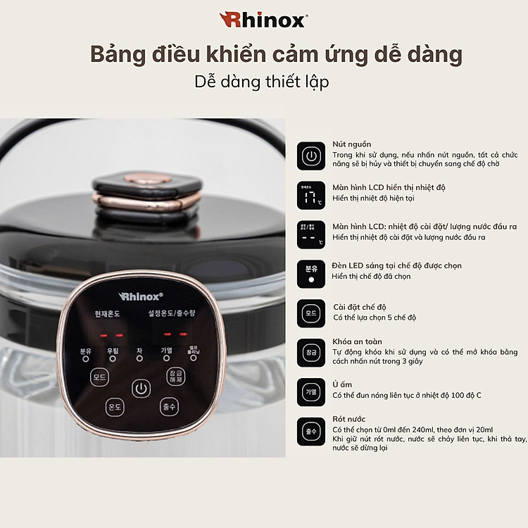 Bình đun đa năng Rhinox 2L điều chỉnh nhiệt độ chuyên pha sữa, trà, cafe - khóa an toàn cho bé