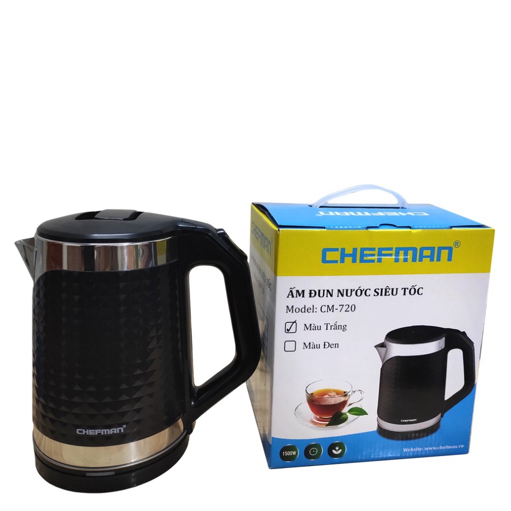 - Chefman CM-720 thiết kế màu sắc đa dạng: Đen và nâu cho Khách hàng lựa chọn phù hợp với sở thích. Ấm siêu tốc có dung tích lên tới 2 lít giúp đun được lượng nước lớn, đáp ứng nhu cầu sử dụng nước nhiều và thường xuyên cho gia đình đông người. - Ấm siêu tốc Chefman CM-720 được chia làm 2 lớp: - Lớp trong cùng bằng inox 304 cực kỳ an toàn cho sức khỏe, chịu nhiệt tốt. - Lớp vỏ bằng nhựa PP chịu nhiệt tốt, không mùi, không sinh ra chất độc hại, độ bền cao. - Nút nhấn mở nắp được tích hợp luôn trên nắp ấm. Tay cầm tích hợp công tắc bật/tắt ấm. Tay cầm chắc chắn, dễ di chuyển rót nước. Đế tiếp điện thiết kế tháo rời giúp nhấc ấm lên từ mọi hướng dễ dàng. - Ấm siêu tốc Chefman CM-720 hoạt động với công suất 1500W, sử dụng nguồn điện áp 220V/50Hz giúp đun nước sôi rất nhanh, chỉ sau vài phút là đã có nước nóng để pha mì, pha trà hay pha sữa cho bé.... - Bình đun nước siêu tốc Chefman có kích thước là 21cm x 16,8cm x 23cm, đặt bàn không tốn nhiều diện tích.