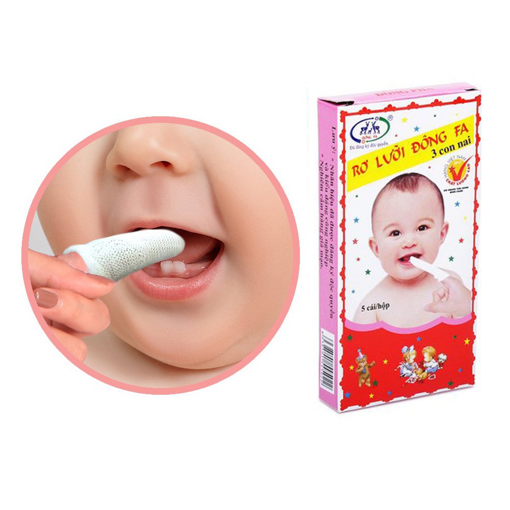 [ẢNH THẬT] Rơ lưỡi cho bé, gạc tưa lưỡi đông pha (nhãn hiệu 3 con nai) (1 HỘP 5 CHIẾC) Em bé cần được rơ miệng mỗi ngày, nếu không sẽ dễ bị nấm miệng (đẹn miệng), nhất là những bé bú mẹ. Chị nên dùng gạc vô trùng (có bán ở các nhà thuốc tây), quấn quanh ngón tay, thấm với nước muối sinh lý (Natri Clorid 0,9%) rồi lau nhẹ nhàng lên lưỡi bé, vùng bên trong má, vùng vòm khẩu (nắp vọng), nướu, môi. Mỗi ngày làm ít nhất 1 lần hay khi thấy lưỡi bé dơ (nên làm trước khi bú để tránh ọc ói).