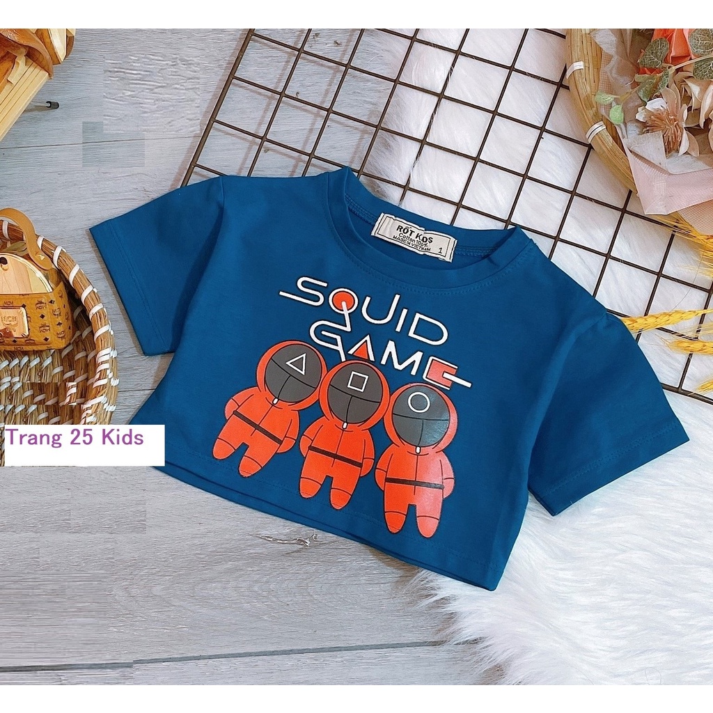 Mô tả: Áo cổ tròn, tay cộc, ngắn tay, áo croptop - Xuất xứ: Việt Nam - Chất liệu: 100% cotton, mềm mại, ko bai, không xù lông, nhẹ dịu với làn da của bé - In hình squid Game - 3 anh áo đỏ