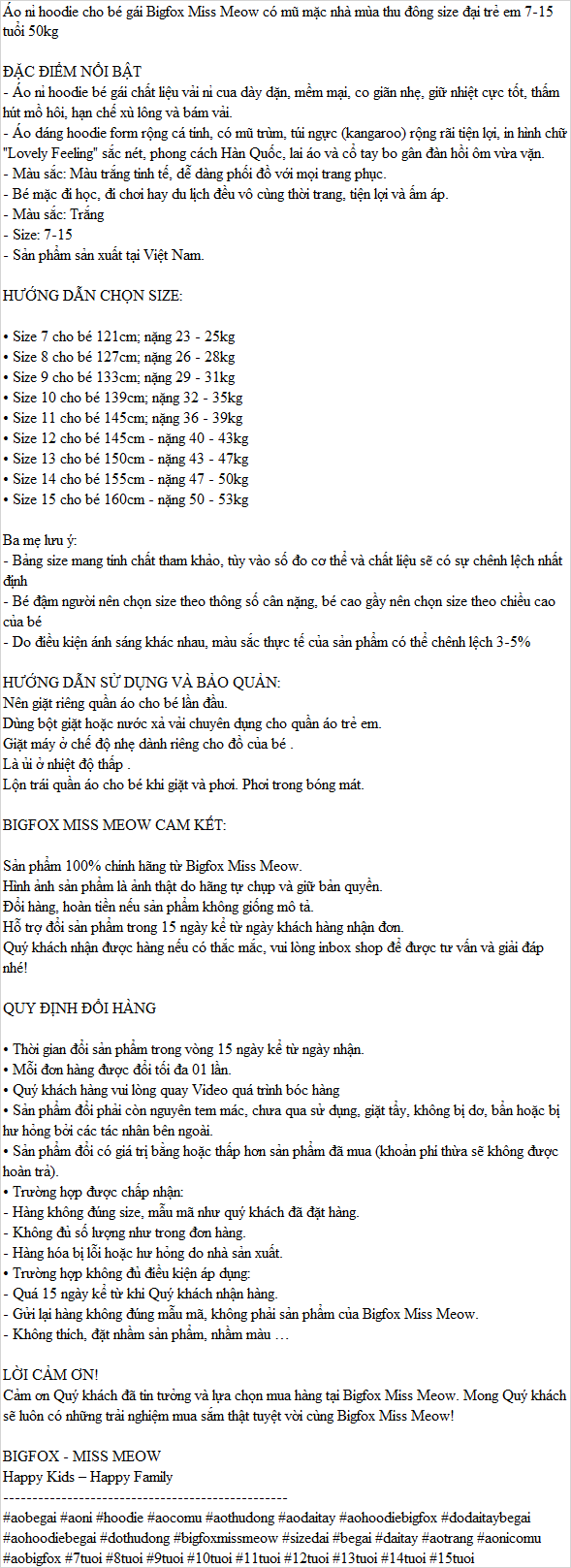 Áo nỉ hoodie cho bé gái Bigfox Miss Meow có mũ mặc nhà mùa thu đông size đại trẻ em 7-15 tuổi 50kgĐẶC ĐIỂM NỔI BẬT- Áo nỉ hoodie bé gái chất liệu vải nỉ cua dày dặn, mềm mại, co giãn nhẹ, giữ nhiệt...