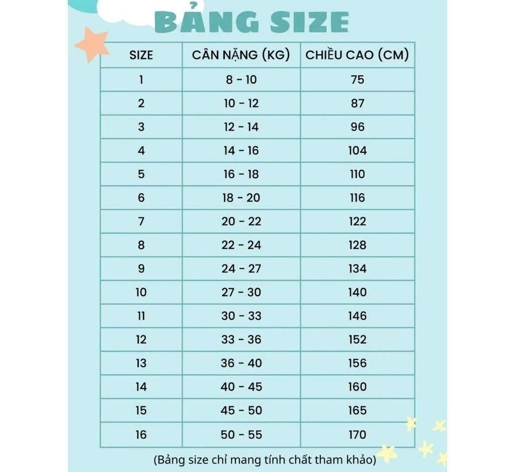 * Size 15 : Cân nặng 45-50kg, chiều cao 165cm