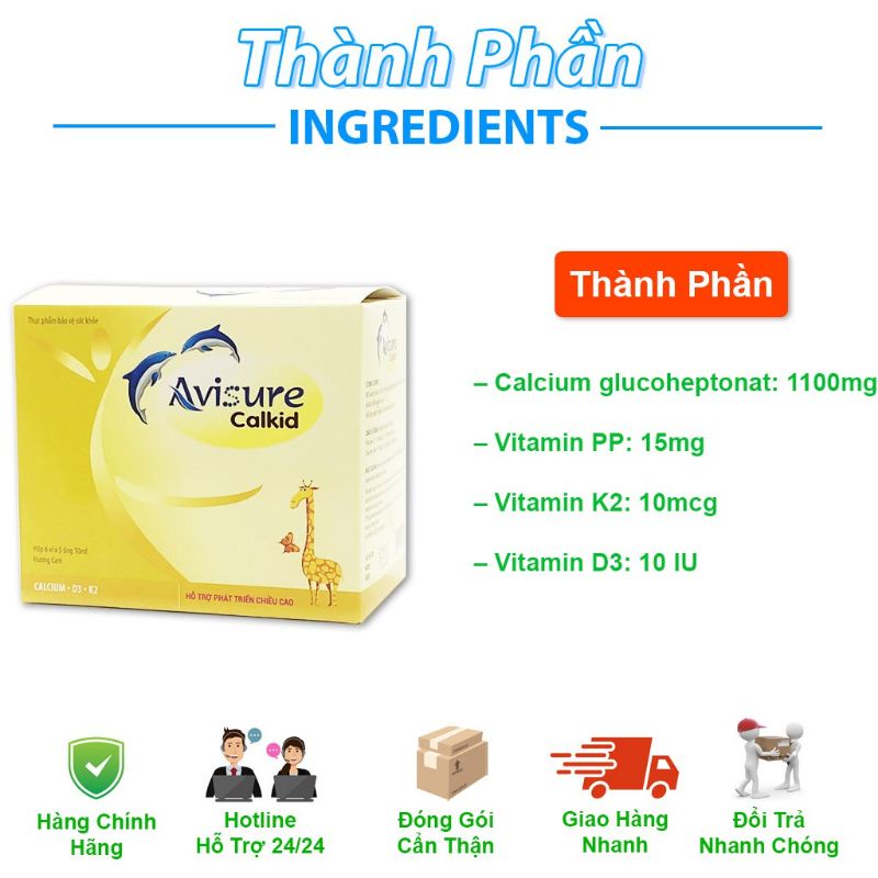 AVISURE CALKID CANXI DÀNH CHO TRẺ NHỎ TỐT NHẤT 1, Thành phần: Calcium glucoheptonat 1100mg Vitamin PP 15mg Vitamin K2 10mcg Vitamin D3 100IU 2, Công dụng: Bổ sung canxi cho cơ thể, giúp xương răng chắc khỏe và hỗ trợ phát triển chiều cao. Hỗ trợ giảm nguy cơ còi xương ở trẻ. 3, Cách dùng: Trẻ 2-14 tuổi: 2-3 ống 1 ngày Trẻ trên 15 tuổi: 2 ống 1 lần x 2 lần 1 ngày
