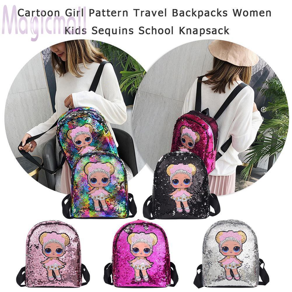 Fashion Cartoon Girl Pattern Travel Backpacks Women Kids School Bags Casual Sequins Knapsack Preppy Style Rucksack Features: Sequins material, durable. Cartoon girl pattern design, cute and stylish.