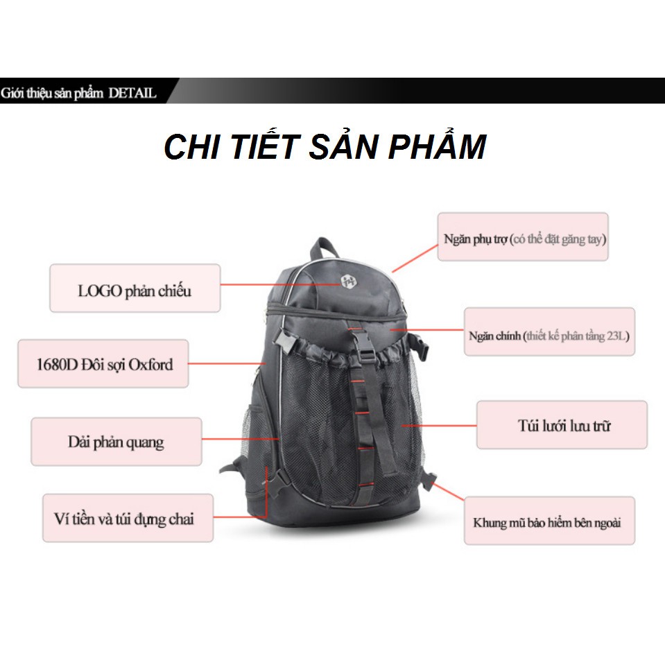 ĐẶC ĐIỂM NỔI BẬT : - Bề mặt được làm bằng vải Oxford sợi kep 1680D, rất bền và chống rách - Vải mềm mại và thoáng khí, đẹp và có thể bảo vệ tốt các đồ vật - Túi lưới bên ngoài mũ bảo hiểm được thiết kế túi lưới cắm vào thuận tiện để lấy ra bất cứ lúc nào - Thiết kế phân lớp bên trong các ngăn chính và phụ có thể đựng máy tính xách tay , điện thoại di động - Dải phản quang vào ban đêm nó có thể nhìn thấy rõ từ một khoảng cách xa khi đi vào ban đêm, nhắc nhở mọi người lưu ý . Để được an toàn , đồng thời đẹp hơn.