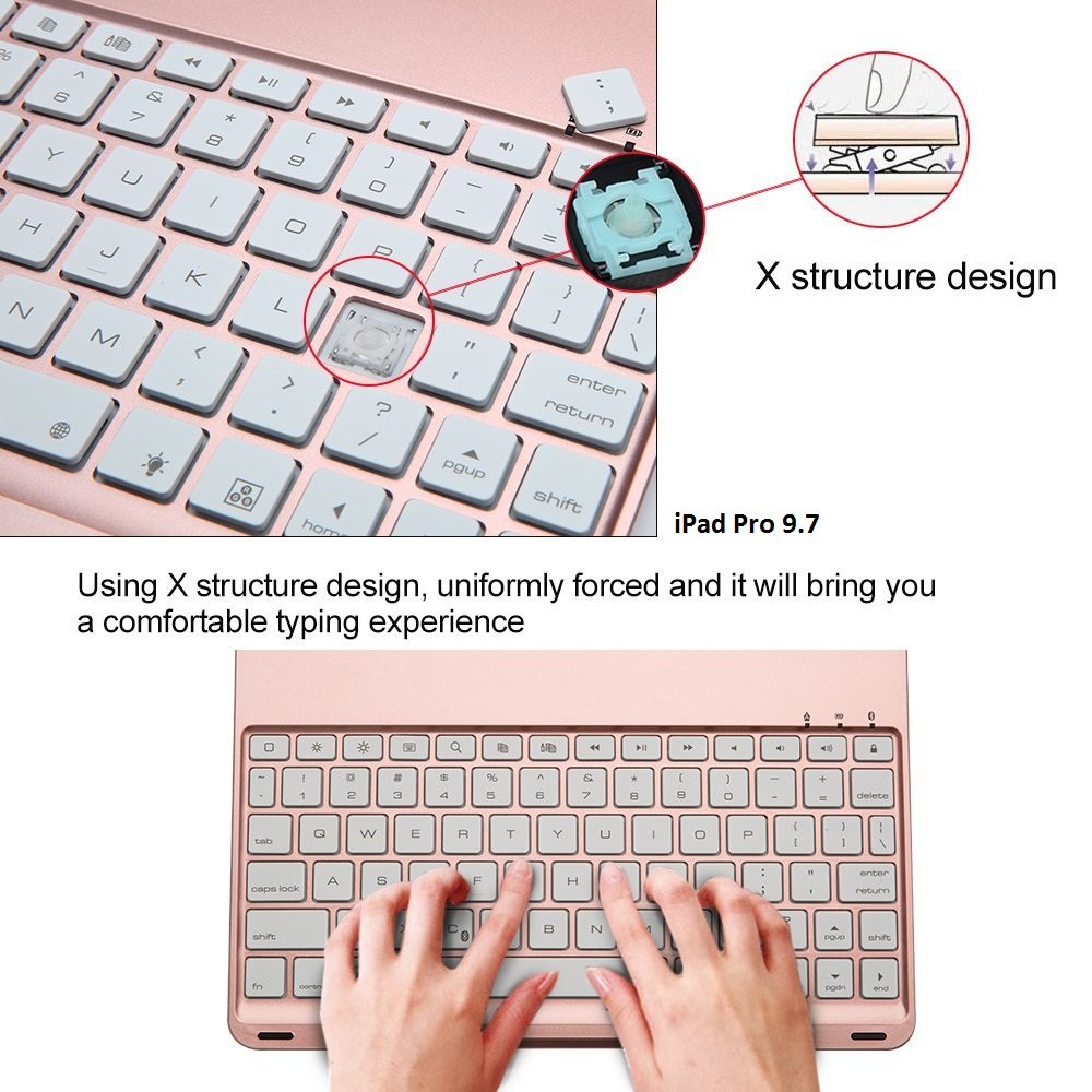 -Bàn phím Bluetooth iPad Pro 9.7'' thông minh với chế độ ngủ cảm ứng từ thông minh có thể được bật/tắt bàn phím, tiết kiệm năng lượng và thuận tiện. - Siêu- mỏng và di động, độ dày của bàn phím chỉ 7mm. -Tương thích cho iPad Pro 9.7'' - Góc ngả tối đa của bàn phím lên đến 135 độ - Phần lưng ốp được khoét tinh tế, khoe trọn apple iCon - Ốp rất chắc chắn, không lo rơi rớt iPad, khi gập lại cầm đi cũng rất yên tâm - Bàn phím gõ nhẹ tay như Laptop, thiết kế thân thiện, tạo cảm giác thoải mái cho người sử dụng - Ôm trọn, bảo vệ Camera iPad một cách hoàn hảo - Bàn phím dùng pin sạc, không tốn thêm tiền mua pin mỗi khi sử dụng, thật tiết kiệm. - Bàn phím tích hợp LED như Macbook, có 7 màu để lựa chọn - Kết nối Bluetooth với iPad để sử dụng, kết nối cực chuẩn, không bị tình trạng gõ trước chữ chạy sau như 1 số loại - Một số thông tin cơ bản về kết nối và chức năng các phím - Download word, excel về iPad để sử dụng office như 1 chiếc laptop - Kích thước nhỏ gọn, thiết kế trang nhã