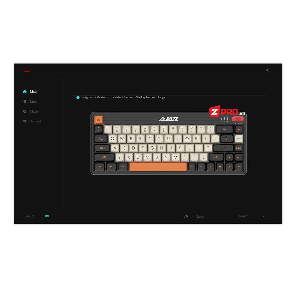 ✳ Thông tin sản phẩm: - Link Sản phẩm : https://zpro.vn/ban-phim-co-ajazz-k690t-hotswap-wireless-bluetooth/p2584.html - Kết nối 3 chế độ: wireless 2.4g, bluetooth 5.0 và dây type-c. - Keycap PBT double shot, custom profile (gần giống SA). - Sử dụng Kailh Box switch, độ bền 80 triệu lần bấm. - Hệ thống led RGB 18 hiệu ứng, tự tắt khi không sử dụng (Ở chế độ không dây), có mode nhảy theo nhạc (Cần dùng mode dây và chọn trong software). - Mạch hotswap giúp thay đổi switch dễ dàng. - Có hỗ trợ layout Mac, pin 2000 mAh. - Có phần mềm tùy chỉnh giao diện tiếng Anh. - Trọng lượng siêu nhẹ chỉ ~ 700 gram. - Phụ kiện: dây cáp, usb receiver, sách HDSD, switchpuller và keypuller. - Hệ điều hành hỗ trợ: XP/7/8/10/Mac. - Bảo hành chính hãng 2 năm (1 đổi 1 trong 10 ngày đầu nếu lỗi kỹ thuật). * Hướng dẫn kết nối bluetooth: - Gạt cần sang BT. - Nhấn giữ Fn + Q/WE đến khi đèn tín hiệu nháy nhanh. - Mở Setting -> Device -> Add Bluetooth device. ** Hướng dẫn cơ bản: - Fn + A/S: Chuyển đổi layout Win/Mac. - FN + ESC: Giữ 4 giây để reset factory. - Fn + \: Đổi hiệu ứng led. - Pin yếu: Đèn ESC sẽ nháy đỏ, đèn phím tự tắt.