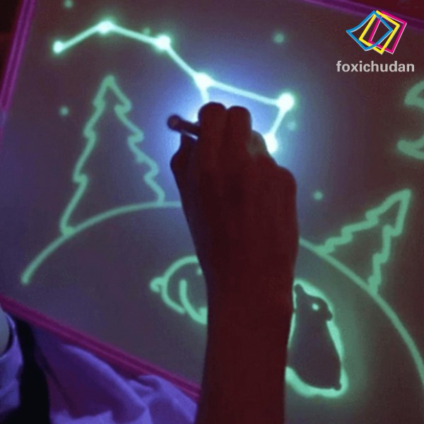 Decription: Features: Size:A4 1.Help the child to reveal its creativity.It is a fun and learning experience in one! 2.With its special tablet board with a light-accumulating coating and a flashlight marker you and your kid can start to draw glowing pictures and letters. 3.At the other end of the marker is a pen with special ink thatappears only under the light of the flashlight. 4.From the touching of the “brush” to the “canvas” there will be light lines, the brightness and clarity of which depends on the distance from the marker to the tablet and the angle of inclination. You can not erase from the work surface, but you can draw on top, since each new line will be brighter than the previous one. Completely the same picture disappears itself in 30-40 minutes. 5.Non-toxic and harmless.Best gift for your children. Notice: Sticker style is random Actual color may be slightly different from the image due to different monitor and light effect Included: 1x Drawing Board 1x Painting Pen 1x Sticker