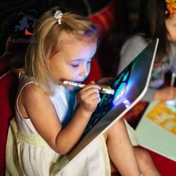 ----------------------------------------------------------------------------- Decription: Features: Size:A4 1.Help the child to reveal its creativity.It is a fun and learning experience in one! 2.With its special tablet board with a light-accumulating coating and a flashlight marker you and your kid can start to draw glowing pictures and letters. 3.At the other end of the marker is a pen with special ink thatappears only under the light of the flashlight. 4.From the touching of the “brush” to the “canvas” there will be light lines, the brightness and clarity of which depends on the distance from the marker to the tablet and the angle of inclination. You can not erase from the work surface, but you can draw on top, since each new line will be brighter than the previous one. Completely the same picture disappears itself in 30-40 minutes. 5.Non-toxic and harmless.Best gift for your children. Notice: Sticker style is random Actual color may be slightly different from the image due to different monitor and light effect Included: 1x Drawing Board 1x Painting Pen 1x Sticker