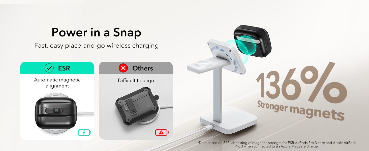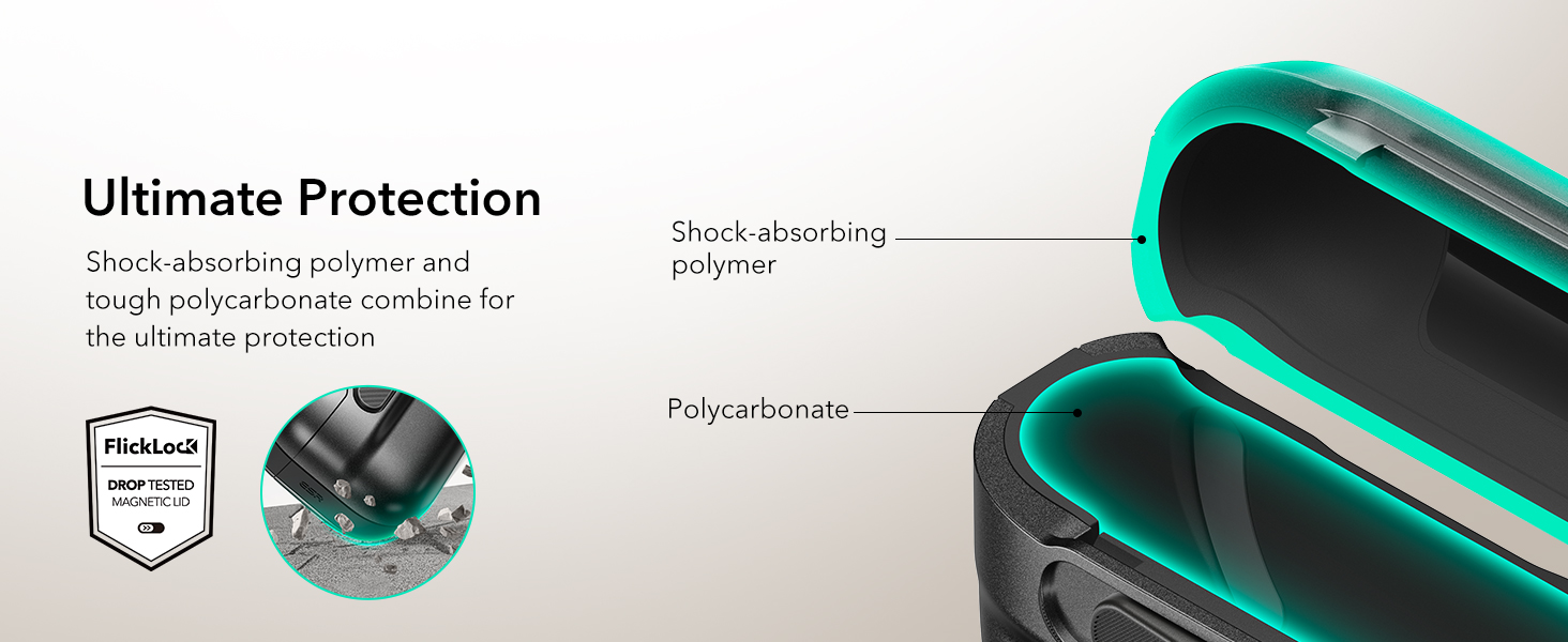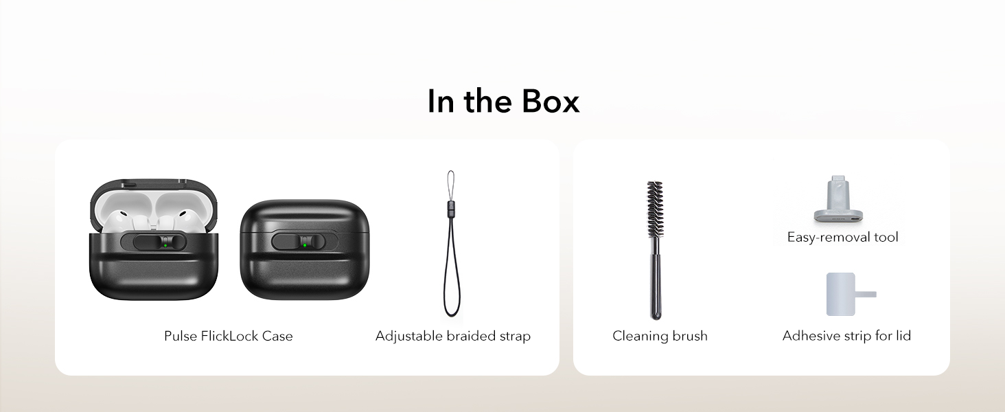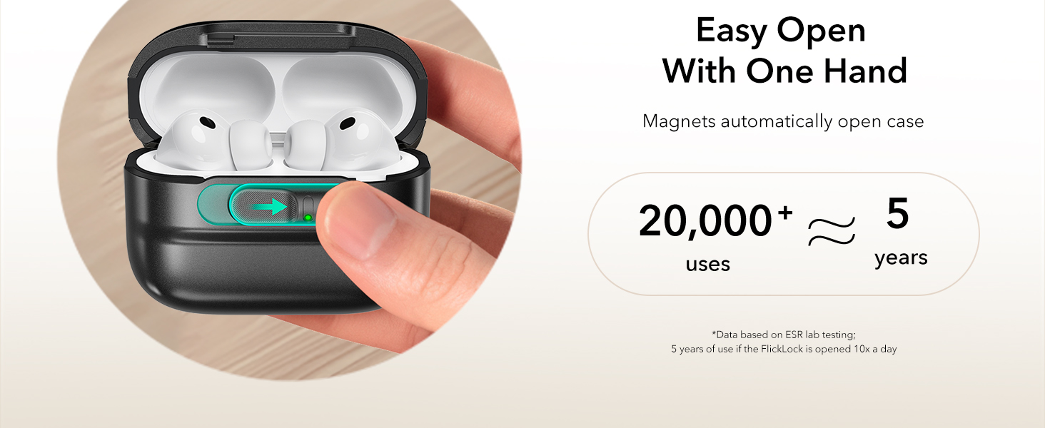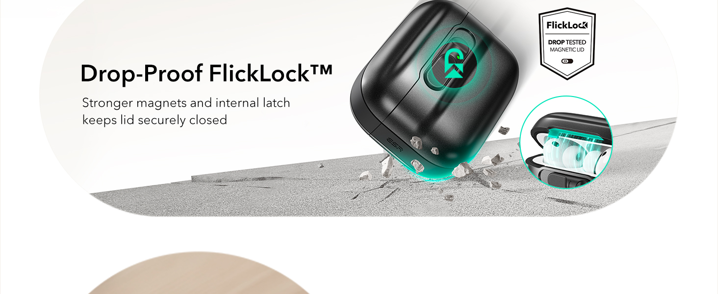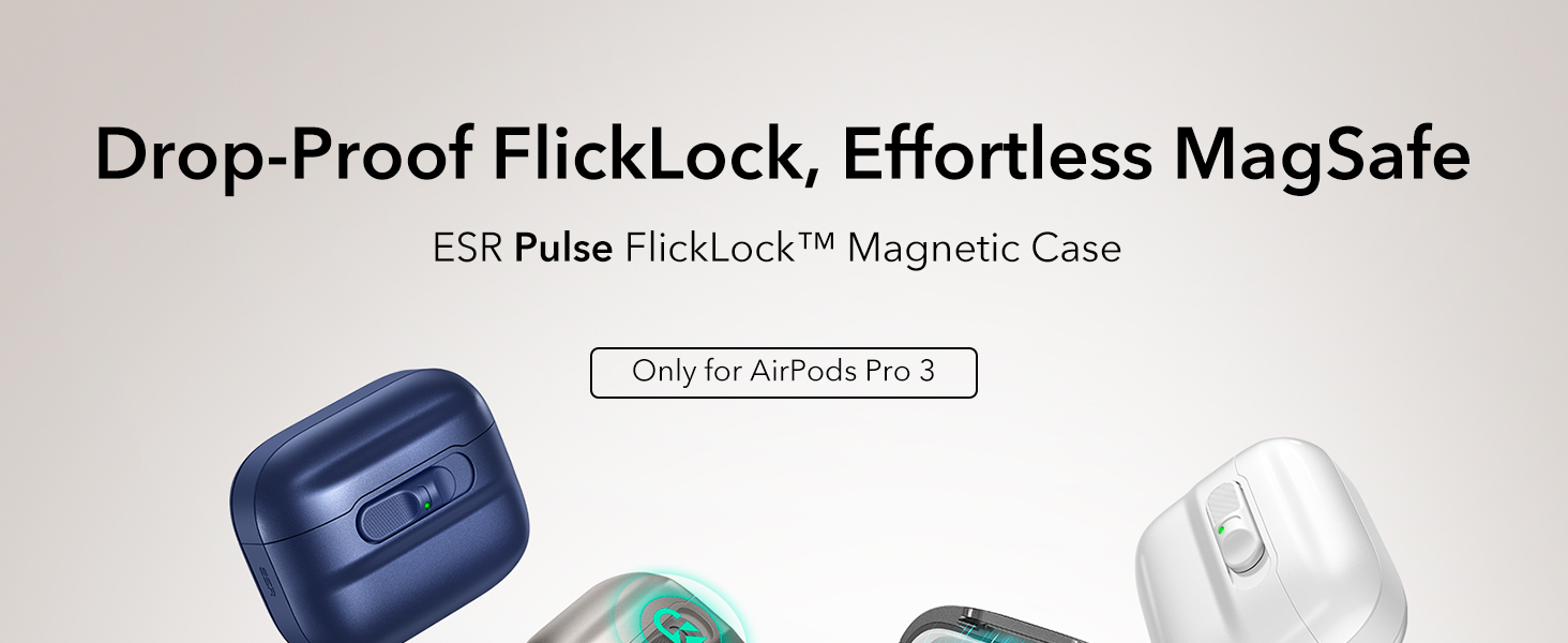 Khóa FlickLock chống rơi : nắp từ tính mạnh mẽ với lực giữ 700g và chốt bên trong giúp giữ chặt AirPods Pro3 của bạn, trong khi khóa FlickLock cho phép mở dễ dàng và tự động.