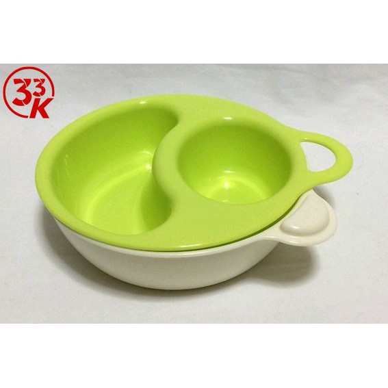 Công dụng: bát ăn dặm cho bé, gồm 2 ngăn, có thể sử dụng trong lò vi sóng