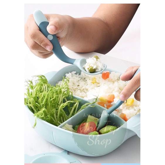 Bộ bát ăn dặm chống đổ chia ngăn cho bé - 5 chi tiết kèm thìa dĩa tập xúc, ống hút silicon và nắp đậy