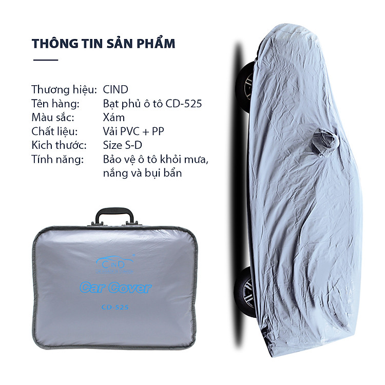 Bạt phủ ô tô CIND CD-525 7 chỗ size S-D 2 lớp PVC+PP được làm từ chất liệu vải PP-PVC chính là một giải pháp hoàn hảo để bảo vệ xe bạn. Đường chỉ viền được may tỉ mỉ, đẹp mắt, bền bỉ lâu dài với thời gian. Đây chắc chắn sẽ là lựa chọn tuyệt vời nhất góp phần bảo vệ ngôi nhà di động của bạn an toàn hơn, và luôn giữ được vẻ sáng bóng của sơn.