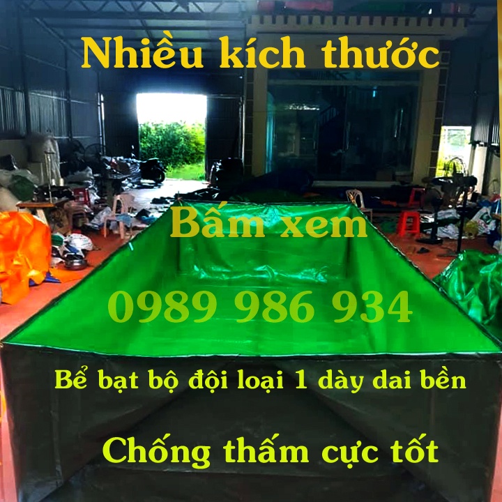 - Chất liệu: PVC 2 lớp xanh nõn chuối và xanh đen, Bạt bộ đội được may thành hình khối, giống như hình ảnh. ( vè nhà có thể chế khung sắt hoặc tre gỗ để đặt bể vào trong hoặc có thể dùng dây buộc các khuy đóng sẵn trên miệng bạt buộc dây căng ra dùng như video. Muốn bạt bền thì quý khách hàng lên làm khung cho chắc chắn)