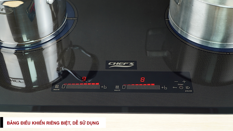 Hẹn giờ: Bếp từ Chef's EH-DIH888E có thể hẹn giờ độc lập cho từng vùng nấu, thời gian hẹn đến 1 giờ 59 phút