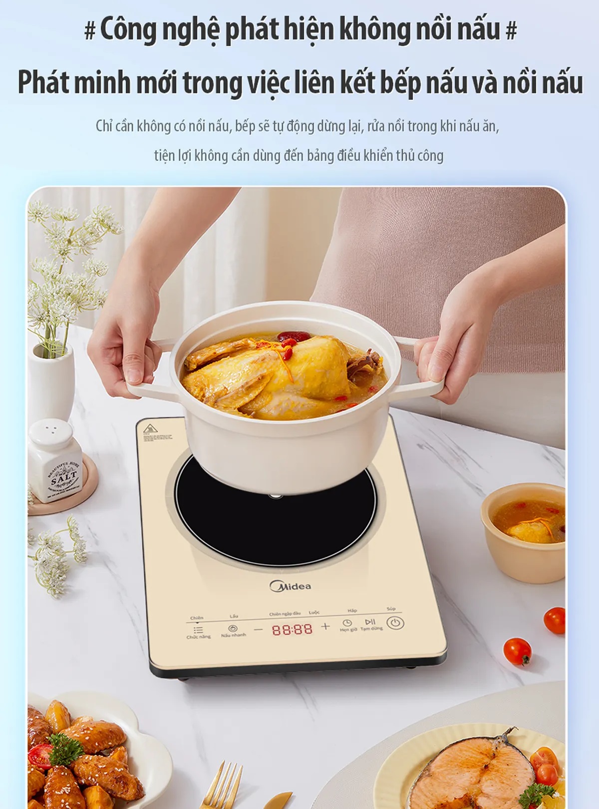 Giới thiệu Bếp từ đơn Midea MIC 221 2200W mặt kính pha lê sang trọng, công nghệ từ trường 3D, mâm nhiệt lớn làm nóng trong 5s, cảm ứng hiện đại, có hẹn giờ, tự ngắt khi bỏ nồi, bảo vệ quá nhiệt (TẶNG NỒI LẨU) - Hàng chính hãng