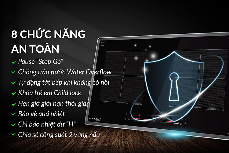 Chức năng chống tràn Water Overflow: Trên tất cả sản phẩm bếp điện từ Eurosun đều tích hợp chức năng an toàn chống trào nước. Khi có nước sôi vô tình tràn trong khi nấu, nước tràn đến khu vực bàn phím điều khiển, sau khoảng 3-5 giây bếp sẽ tự động ngừng hoạt động để đảm bảo an toàn cho người sử dụng không bị bỏng hay chập điện.
