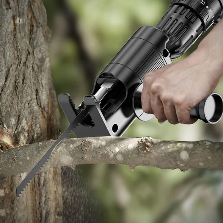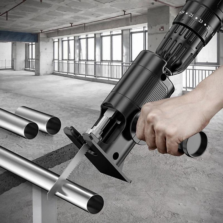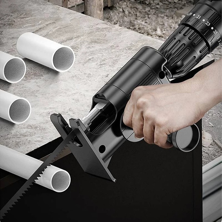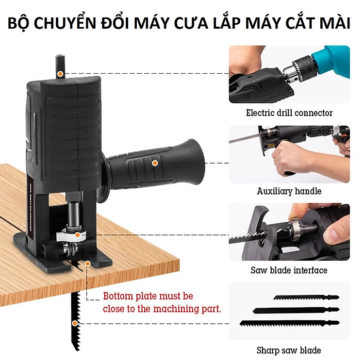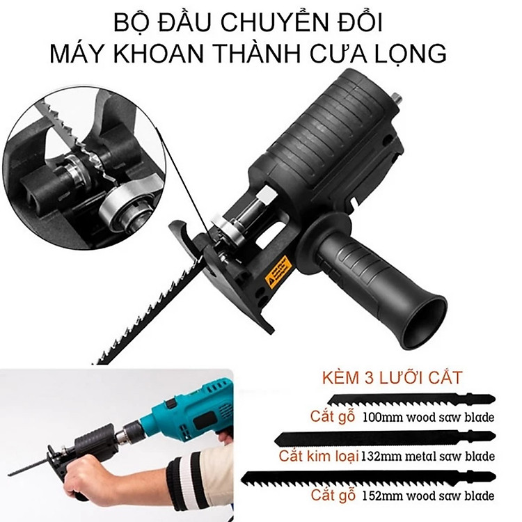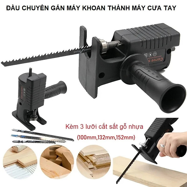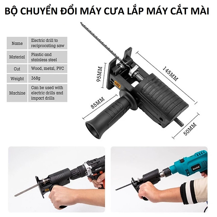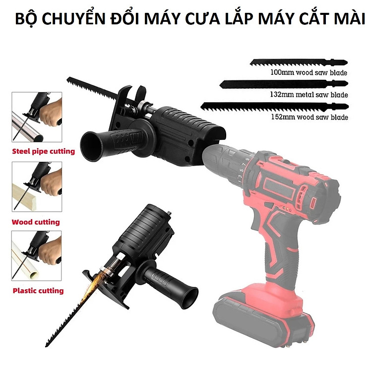 - Bộ sản phẩm bao gồm: bộ chuyển đổi + tay cầm phụ + 3 lưỡi cưa Thông số sản phẩm Bộ Chuyển Đổi Máy Khoan Thành Máy Cưa Lọng Chất liệu: ABS + kim loại