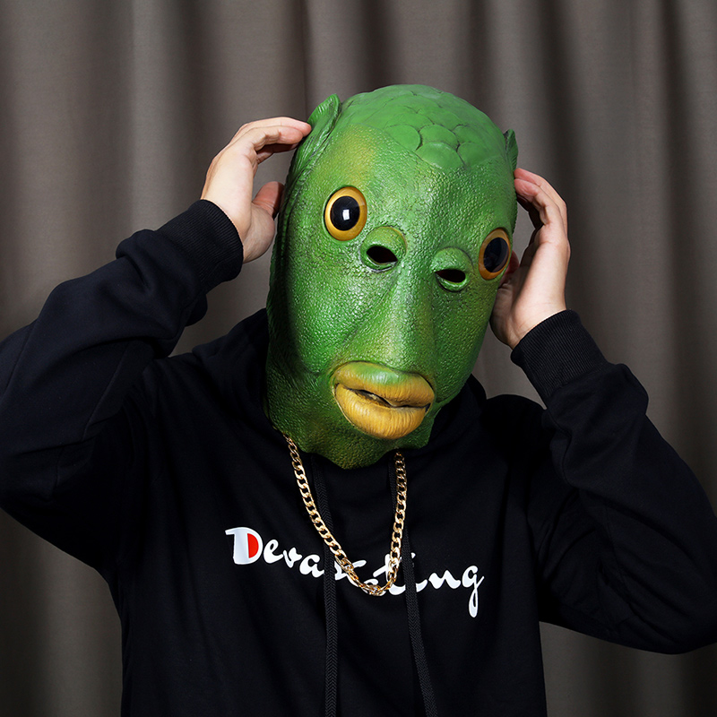 Đặc trưng: 1. Chất liệu latex tự nhiên: thân thiện với môi trường, thoải mái khi đội. 2. Hình quái vật cá xanh: kỳ dị thu hút sự chú ý của đám đông, phù hợp với không khí lễ hội Halloween. 3. Mặt nạ quái vật cá: hình ảnh ba chiều và chân thực