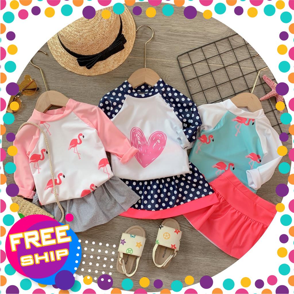 Bikini Bộ Bơi Bé Gái Áo Tay Dài Và Quần Váy Họa Tiết Xinh Xắn Hàng Quảng Châu Cho Bé Từ 7-21kg
