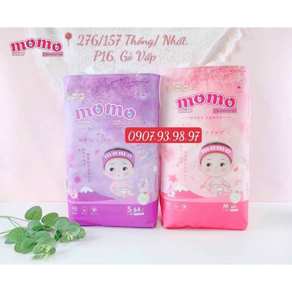 2. ƯU ĐIỂM NỔI BẬT CỦA BỈM MOMO DIAMOND. 💎 Bỉm Momo Diamond là dòng organic nguyên liệu thiên nhiên với lõi thấm hút vượt trội tăng khả năng thấm hút sâu. 💎 Khả năng thấm hút 1,5 lít nước đóng ngày và đêm làm thay đổi xu hướng dùng bỉm cho bé yêu của các mẹ. Từ bây giờ có thể đóng 12 tiếng mà không lo bỉm tràn rồi. 💎 Thành phần Flavonoid Glycosides trong tinh chất hoa anh đào có tác dụng dưỡng da, giảm kích ứng da, viêm da, loại bỏ các triệu chứng ngứa ngáy, tấy đỏ giúp cho làn da nhạy cảm của bé sẽ được nâng niu, bảo vệ. 💎 Cấu tạo của bỉm gồm 5 lớp, đặc biệt phần lõi thấm 440g (vượt trội hơn hẳn lõi thấm của các loại bỉm thấm hút thông thường hiện nay là 420).Giúp nước thẩm thấu sâu hơn, nhanh hơn. 💎 Công nghệ mới, đai thun chữ S ở đáy bỉm ôm trọn bờ mông của bé, giúp bé thoải mái vui đùa cả ngày không lo tràn bỉm. ❣️ Kết hợp cùng các tính năng đã có ở bỉm Momotaro và thêm các tính năng vượt trội hơn hẳn, tạo nên một siêu phẩm Momo Diamond mang đến cho trẻ thêm cảm giác thoải mái, êm ái mọi lúc mọi nơi. ✳️✳️✳️Bảng size Momo Diamond: 👉Tã dán: S (64 miếng):4-8kg M (62 miếng):6-11Kg