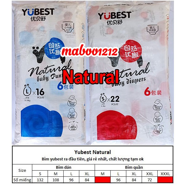 Chi tiết sản phẩm: 1, Bỉm Yubest Natural: Dòng bỉm ra mắt đầu tiên (Bỉm quần: bao bì xanh, Bỉm dán: bao bì đỏ) - Bỉm dán: S132 miếng, M108 miếng, L96 miếng, XL84 miếng - Bỉm quần: L96 miếng, XL84 miếng, XXL72 miếng 2, Bỉm Yubest Angel: Dòng bỉm cao cấp, ra mắt phiên bản 2 được cải tiến ở bề mặt thấm hút. Bỉm mềm mại hơn, thấm tốt hơn dòng Natural ra mắt trước đó (Bỉm quần: Vỏ trắng ngà, chữ nâu; Bỉm dán: Vỏ trắng, chữ xanh) - Bỉm dán: S90 miếng, M84 miếng, L78 miếng, XL72 miếng - Bỉm quần: M84 miếng, L78 miếng, XL72 miếng, XXL66 miếng, XXXL66 miếng 3, Bỉm Yubest Gold: Được nâng cấp lên từ Angel. Bỉm cải tiến phần đũng, đai chun đệm mây và khả năng chống tràn vượt bậc, bỉm đỡ khai hơn (Bỉm quần: xanh lơ, Bỉm dán: ghi xám) - Tã dán: S90 miếng, M84 miếng, L78 miếng, XL72 miếng - Tã quần: M84 miếng, L78 miếng, XL72 miếng, XXL66 miếng, XXXL66 miếng 4, Bỉm Yubest Night: Cực phẩm về thấm hút. Lớp mặt đáy thoáng khí giúp miếng thoát được hơi ẩm, bé đỡ khó chịu. - Tã dán: S80 miếng, M76 miếng, L72 miếng, XL68 miếng - Tã quần: M76 miếng, L72 miếng, XL68 miếng, XXL64 miếng, XXXL60 miếng 5, Bỉm Yubest Natural trắng cao cấp: Form bỉm ôm dáng, nhỏ gọn. Hạt thấm hút và nguyên liệu thế hệ mới, giúp chống tràn và hăm hiệu quả. Vỏ bỉm màu trắng xinh xắn. - S44 miếng (Dán) ~ 4-8kg - M40 miếng (Dán+Quần) ~ 6-11 kg - L39 miếng (Dán + Quần) ~ 9-14 kg - XL36 miếng (Quần) ~ 12-17 kg - XXL34 miếng (Quần) >15kg