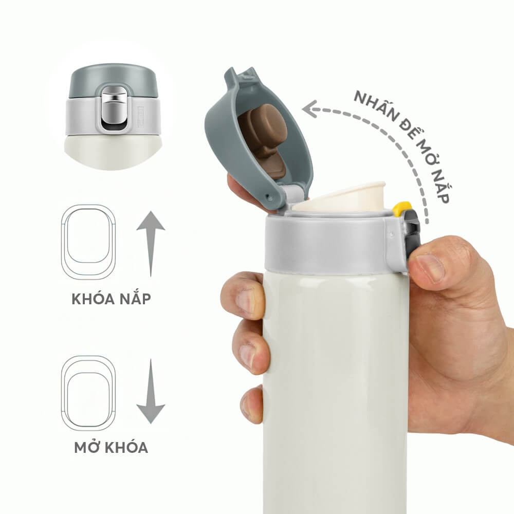 2. Miệng bình rộng dễ dàng bỏ đá và làm sạch, Nắp bật 1 chạm và miệng rót tiện dụng, tiện lợi khi vừa vận động vừa uống
