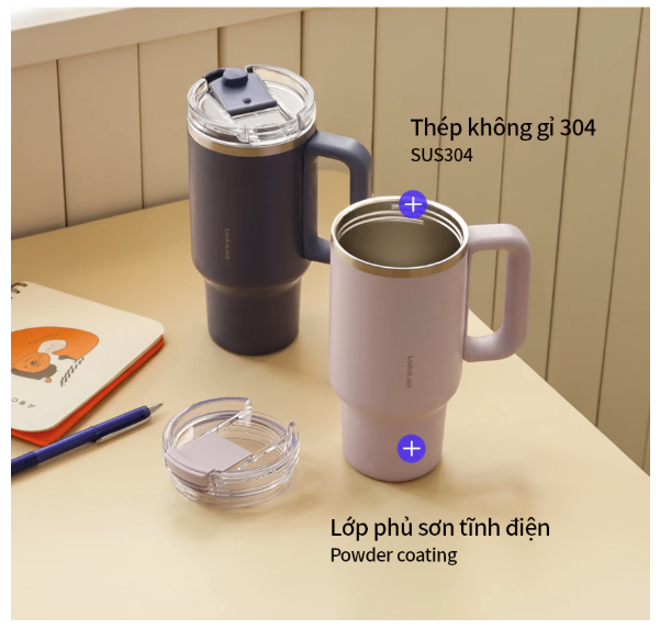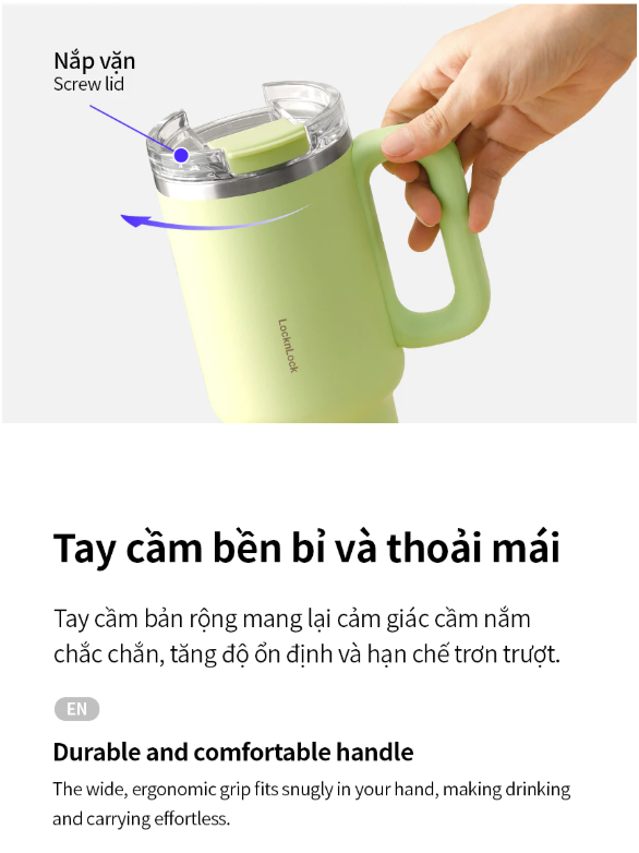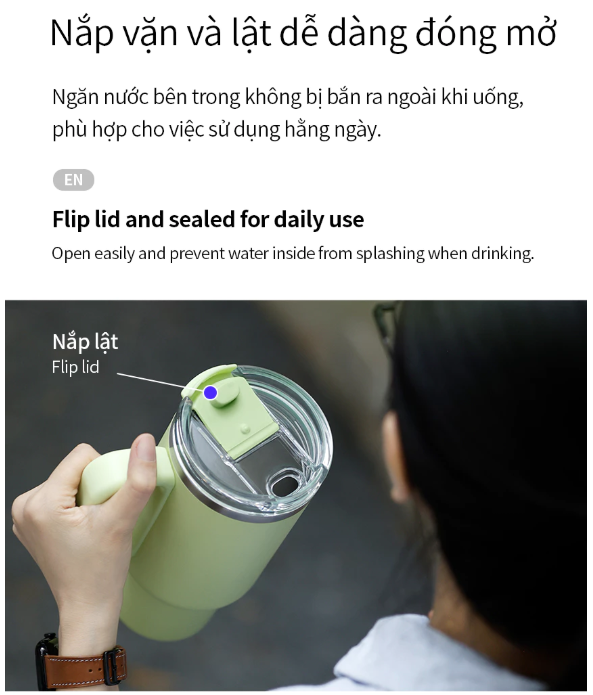 - Nắp vặn cùng với nắp lật tiện lợi cho việc sử dụng hàng ngày, đảm bảo vệ sinh, ngăn bụi cũng như giúp duy trì nhiệt độ nước bên trong.