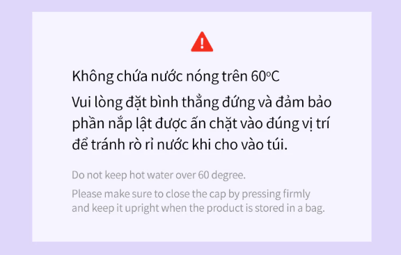 - Vui lòng đặt bình thẳng đứng và đảm bảo phần nắp lật được ấn chặt vào đúng vị trí để tránh rò rỉ nước khi cho vào túi