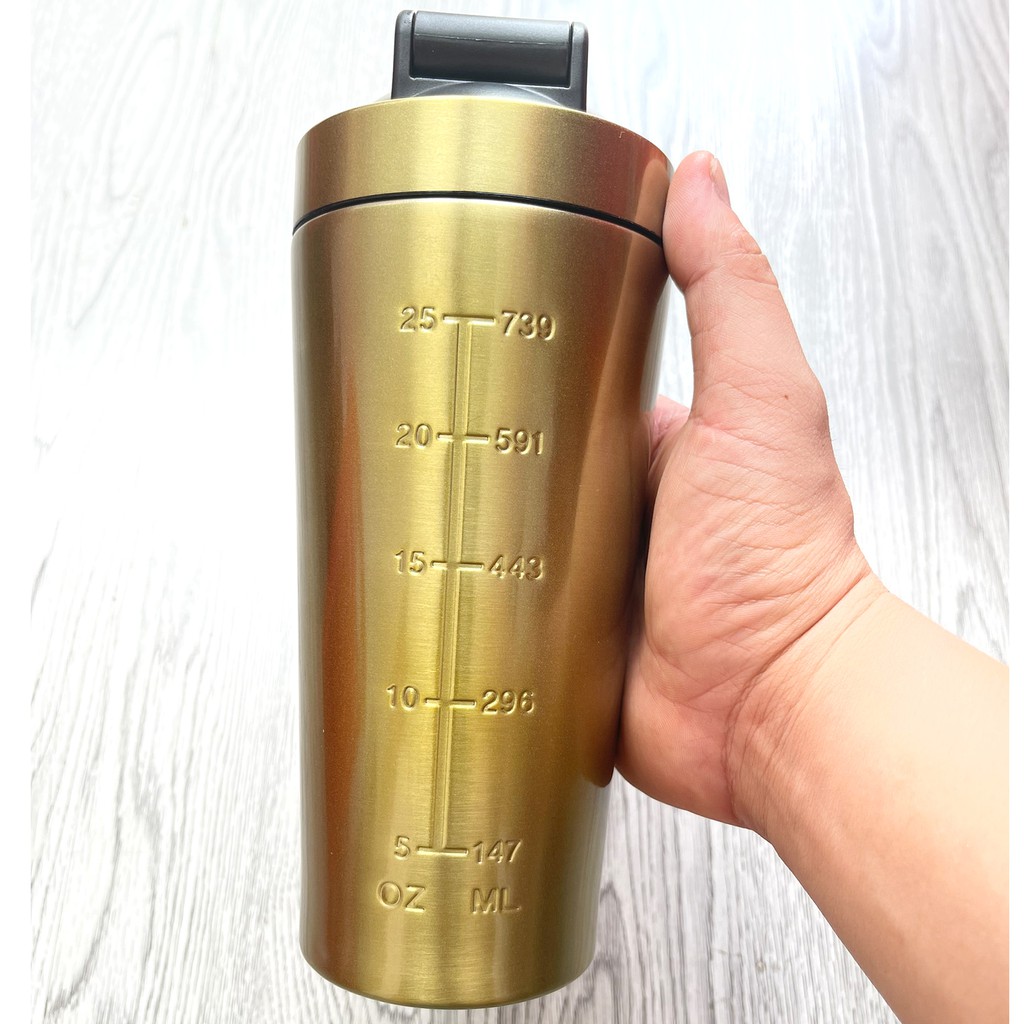 Bình lắc 739ml tiện dụng, đa mục đích Cải tiến sử dụng rãnh xoáy nắp để đánh tan bột không cần bi lắc Chất liệu Inox sáng bóng, độ bền cao Bình Lắc Inox 739ml Giữ Nhiệt Trên 6h, thiết kế đẹp mắt, với chất liệu inox 304 có khả năng giữ nhiệt cao là sản phẩm cần thiết khi bạn đi tập gym, du lịch, đi học ,đi công tác. - Với khả năng giữ đá lạnh lên đến 4h. Giữ nóng lên đến 4h. Bình được thiết kế tiện dụng với van khóa chắc chắn bao gồm 1 ron cao su giúp phần nắp luôn gắn khít với thân bình giúp bạn dễ dàng lắc pha chế các loại sữa Whey Protein cho người tập gym thể hình, các loại cafe nước ép, cafe, cocktail trà sữa hàng ngày mà ko bị đổ hay tràn ra ngoài . - Sản xuất trên dây chuyền công nghệ hiện đại, chất liệu inox 304 cao cấp đảm bảo chất lượng an toàn cho người tiêu dùng, sản phẩm còn dễ dàng vệ sinh. - Có độ bền cao, chịu được nhiệt độ từ -20 đến 100 độ C, có thể giữ được nhiệt độ lên đến hơn 4h. Có khả năng chống móp méo khi va đập hoặc rớt khi đi đường.