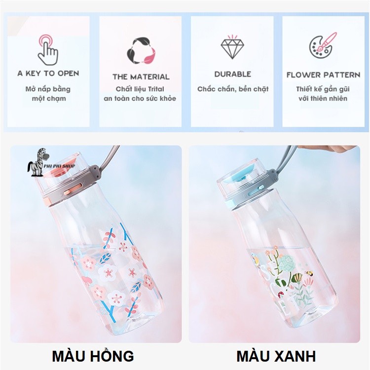 - Chất liệu: thân bình làm từ nhựa Tritan - Dung tích: 500ml - Màu sắc tươi sáng, thiết kế gần gũi với thiên nhiên - Mở nắp chỉ bằng 1 chạm - Chất liệu nhựa Tritan an toàn cho sức khỏe - Thân bình cứng cáp - Có nút khóa nắp đễ ngăn tình trạng vô tình mở nắp hay rò rĩ nước - Họa tiết bắt mắt - Màu sắc tươi sáng - Nhỏ gọn dễ dàng mang theo bên mình hằng ngày