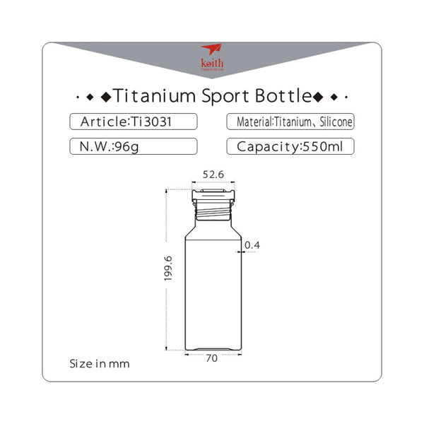 Binh nước Titanium KEITH Ti3031 550ml được làm từ chất liệu titan thân thiện với sinh học, có trọng lượng nhẹ, độ bền và độ cứng cao, thân thiện với môi trường và an toàn, không độc hại, không gây hại cho cơ thể con người và an toàn hơn khi sử dụng lâu dài. Sản phẩm có mã chống hàng giả độc lập, chất lượng đảm bảo. Thiết kế thân nồi tích hợp độc quyền, không hàn trên thân và đáy bình (hiện tại công nghệ này chỉ có ở Kaisi), không có khe hở và không bám cặn. Nắp được ren và trang bị vòng đệm silicon cao cấp tốt cho sức khỏe, kín khí và kín nước. Bình có thể đựng trà, rượu, cà phê, đồ uống và các thực phẩm khác (không dùng chứa nước soda có ga hoặc đồ uống có ga nào để tránh nguy cơ nắp bật ra do giãn nở khí).
