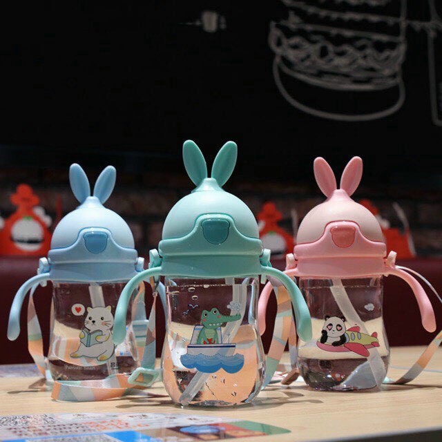 Bình uống nước cao cấp có ống hút chống sặc cho bé hình tai thỏ 250ml có dây đeo