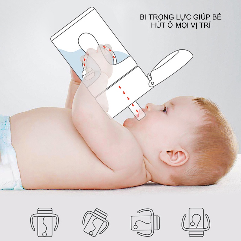Miệng ống hút chữ V chống trào ngược và chống sặc giúp bé có thể uống ở mọi tư thế: nằm, ngồi, đứng, đi,... Bé chỉ cần cắn nhẹ vào ống hút thì sẽ hút được và bé nhả ra thì ống hút sẽ tự động đóng lại, ngăn bé bị sặc. Thân bình hình trụ bo tròn giúp bình chắc chắn nhưng cho cảm giác mềm mại, mịn màng Vật liệu Silicon mềm mại tiêu chuẩn thực phẩm từ công ty Wacker của Đức, không làm bé đau nướu. Hệ thống thông khí một chiều giúp bé hút nước ra dễ dàng nhưng không bị trào ra ngoài Bị trọng lực cuối ống hút giúp bé có thể uống ở mọi tư thế: nằm, ngồi, đứng, ... Thân bình nhựa PPSU chắc chắn, không bị vỡ khi rơi từ trên cao Có thể khử trùng bình ở nhiệt độ cao, bằng nước sôi 100oC, hơi nước hoặc tia UV Dung tích bình: 240ml, độ tuổi sử dụng: trên 6 tháng