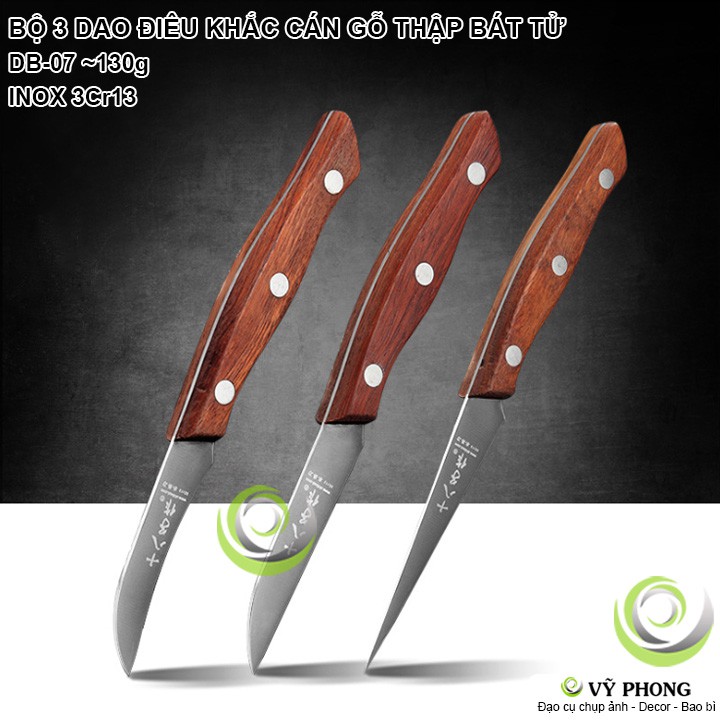 BỘ 3 DAO ĐIÊU KHẮC ĐẦU BẾP THẬP BÁT TỬ INOX CÁN GỖ NGHỆ THUẬT KHẮC HOA QUẢ TRÁI CÂY TRANG TRÍ DB-07