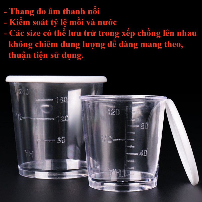 *Thông Số Kĩ Thuật : - Thiết kế : nhỏ gọn, thuận tiện dễ dàng sử dụng và mang theo. - Chất liệu : Nhựa ABS cao cấp dày dặn , chắc chắn và bền bỉ - Bộ sản phẩm gồm 4 cốc với dung tích : 30ml 60ml , 120ml , 200ml. - Thành cốc dày 2.5mm chịu được áp lực, rơi rớt và không dễ hư hỏng *Ưu Điểm : - Thiết kế : quy mô 3 chiều , thang đo rõ ràng, phép đo chính xác, kiểm soát tỉ lệ mồi và nước -Các size có thể lưu trữ , xếp chồng lên nhau, không chiếm dung lượng diện tích.