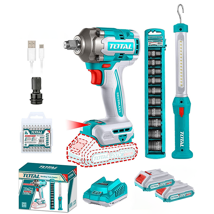 Bộ combo máy siết buloong không chổi than TIWLI2040 & dèn làm việc TWLI35261 dùng pin 20V. Kèm theo: 1 dây sạc USB 10 đầu tuýp tác động DR. 1/2" 1 đầu tuýp vuông 1/2" & lục giác 1/4" 10 mũi vít PH2+SL6.0 65mm 2 pin 2.0Ah (TFBLI20011); 1 sạc (TFCLI2001) Điện áp sạc: 220-240V~50/60Hz Đóng gói bằng hộp màu