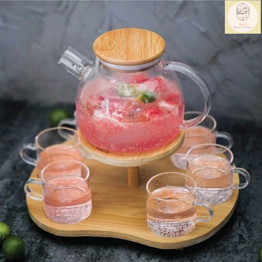 Bộ ly trà thủy tinh chịu nhiệt kèm cốc và khay gỗ 2 tầng phong cách Nhật Bản MS2 Cấu tạo: gồm 1 khay gỗ 2 tầng + 1 bình thủy tinh chịu nhiệt nắ gioăng cao su có thể đun trực tiếp trên bếp ga + 6 chén nhỏ Bình trà thủy tinh chịu nhiệt cao (Cao*Rộng): 18.5*13cm - Dung tích 1.6l Chén thủy tinh (Cao*Rộng)*6c: 5.8*5.8cm Khay 2 tầng cao 10.5cm: Khay nhỏ đựng bình (đường kính): 13.5cm Khay dưới định chén thủy tinh (Dài*Rộng): 28*23cm.