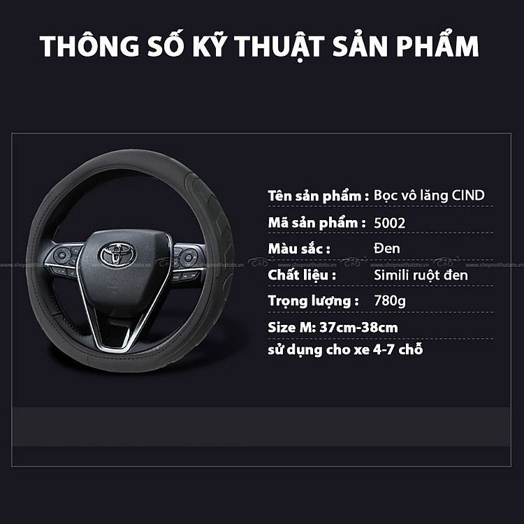 - Bọc vô lăng CIND 5002 size M màu đen sử dụng những chất liệu cao cấp, mang đến sự dễ chịu nh ất đến người sử dụng. Sản phẩm tạo cảm giác mềm mại, dễ chịu không gây thô cứng, đau nhức tay hay gây trơn trượt mồ hôi khi lái xe trong thời gian dài. Kiểu dáng sang trọng sẽ mang đến cho không gian xe bạn một nét chấm phá mới, vừa nổi bật vừa đồng bộ cùng những phụ kiện khác.