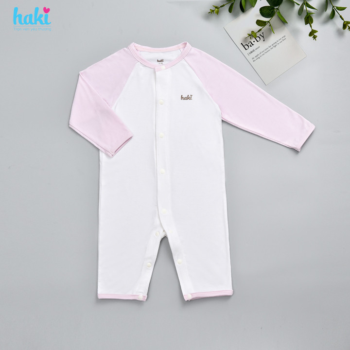 - Haki sử dụng 100% cúc bấm nhập khẩu từ Nhật, mịn, lì và chắc chắn tuyệt đối. Điều này giúp ba mẹ dễ dàng thao tác khi thay trang phục cho bé, đồng thời để bé thoải mái khi lẫy, bò mà chẳng lo cứng cộm.