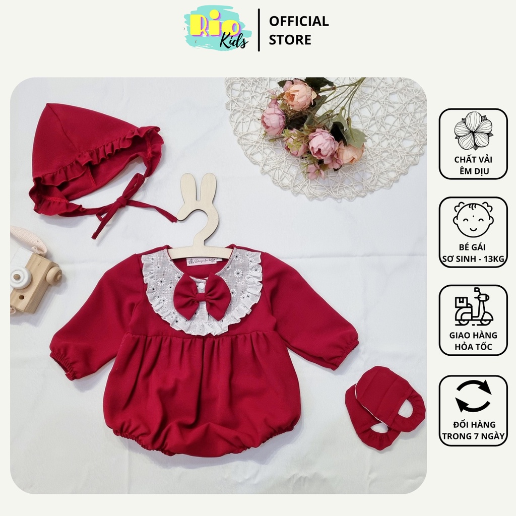 Bodysuit áo liền thân đỏ thiết kế cao cấp cho bé gái sơ sinh đến 13kg tặng kèm mũ và giày vải - Riokids BD3