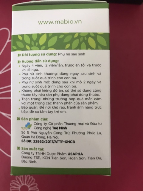 * Thông tin chi tiết sản phẩm: Viên uống lợi sữa Mabio Xuất xứ: Việt Nam Sản xuất tại: Công ty TNHH Dược Phẩm USAPHA Quy cách: lọ 60 viên